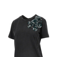 Short-sleeved crewneck T-shirt made from cotton jersey with washed-out finish, enriched with sequines and beads flowers embroidery on the left shoulder. Regular fit. DETAILS Model code: 106030 Color code: Z98 Season: FW25 Material: 100% CO Made in: India Sku: 28056 Color: Black Brand: PINKO