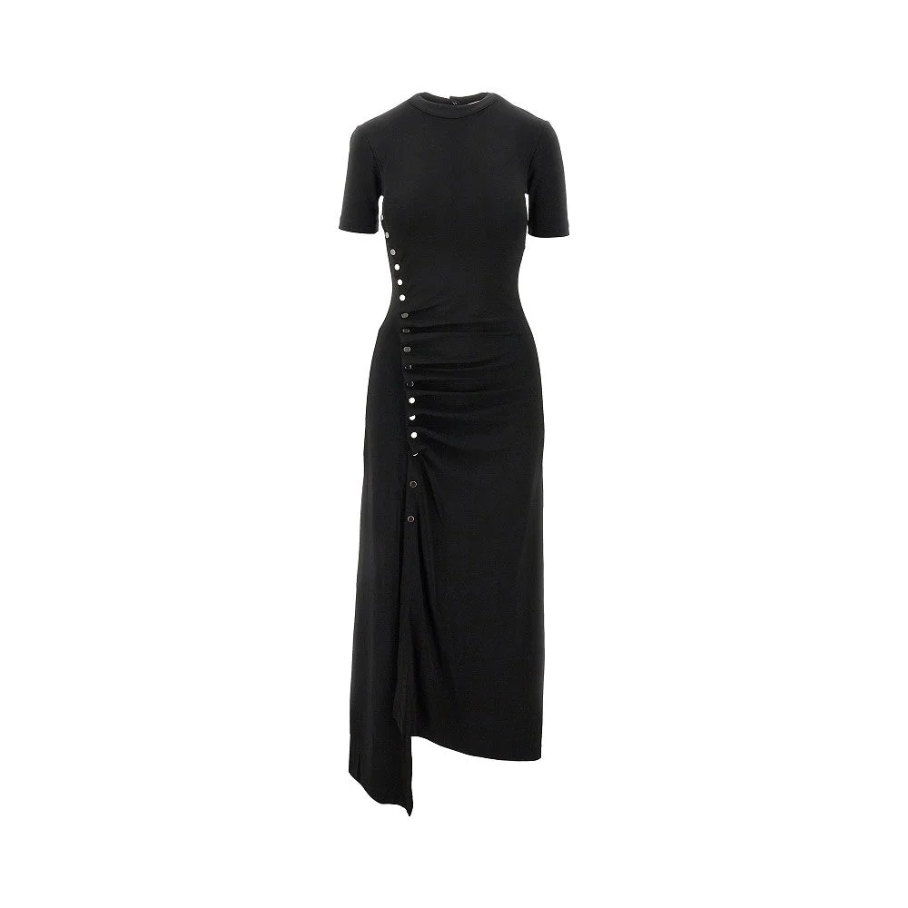 Short-sleeved ankle-length dress made from stretch viscose jersey, featuring side gathered opening with silver-finished press-studs and bottom split. Asymmetrical hem. Crewneck with key-hole press-stud closure on the back. Fitted silhouette. DETAILS Model code: 24AJRO886 Color code: P001 Season: SS26 Material: 95% VI, 5% EA Made in: Portugal Sku: 17123 Color: Black Brand: RABANNE