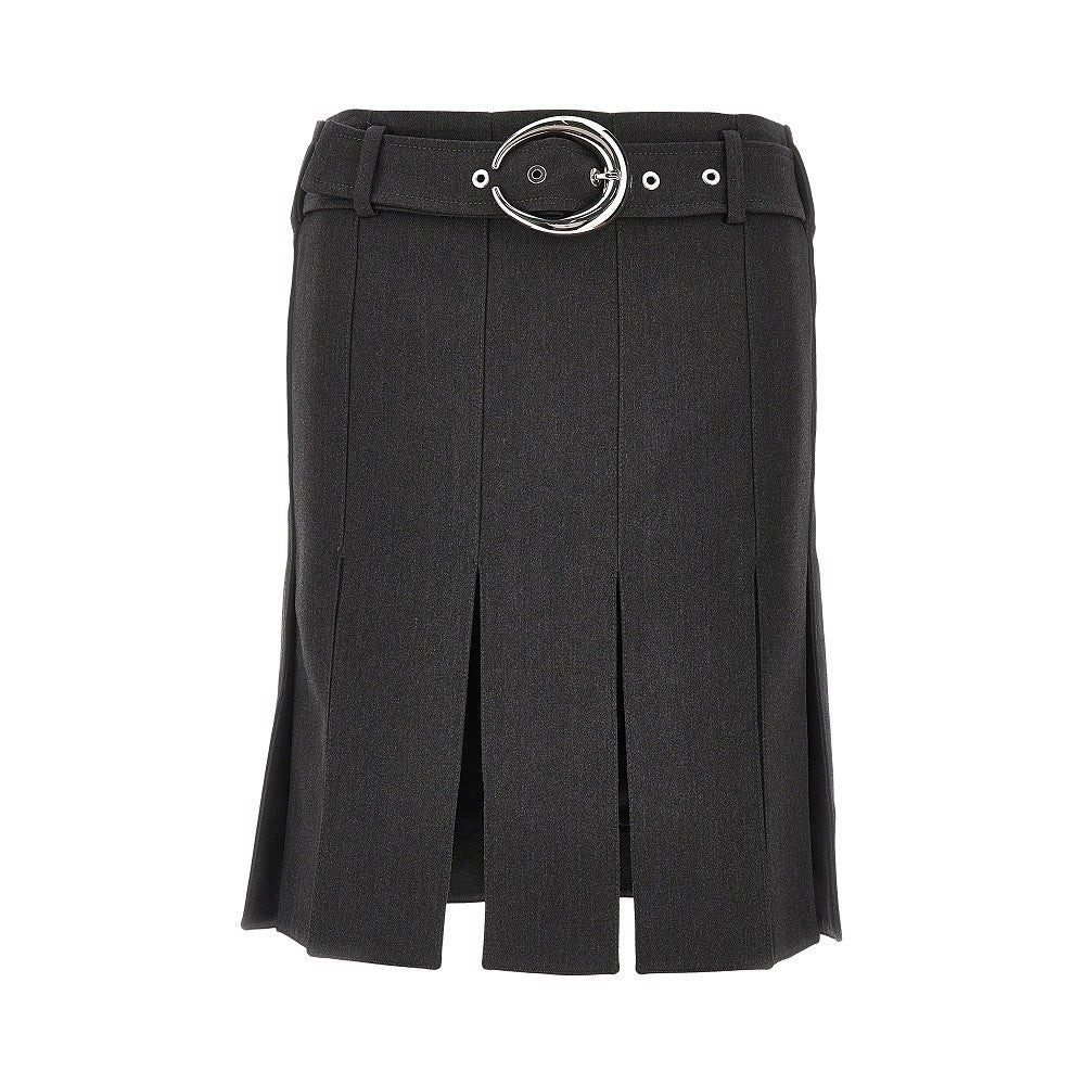 Knee-length skirt made from virgin wool canvas, featuring parallel splits at front and integrated belt with silver-finished metal buckle. Zip closure at back. Straight and regular silhouette. Lined. DETAILS Model code: 25HCJU115 Color code: M372 Season: FW25 Material: 100% WV Made in: Morocco Sku: 28926 Color: Grey Brand: RABANNE