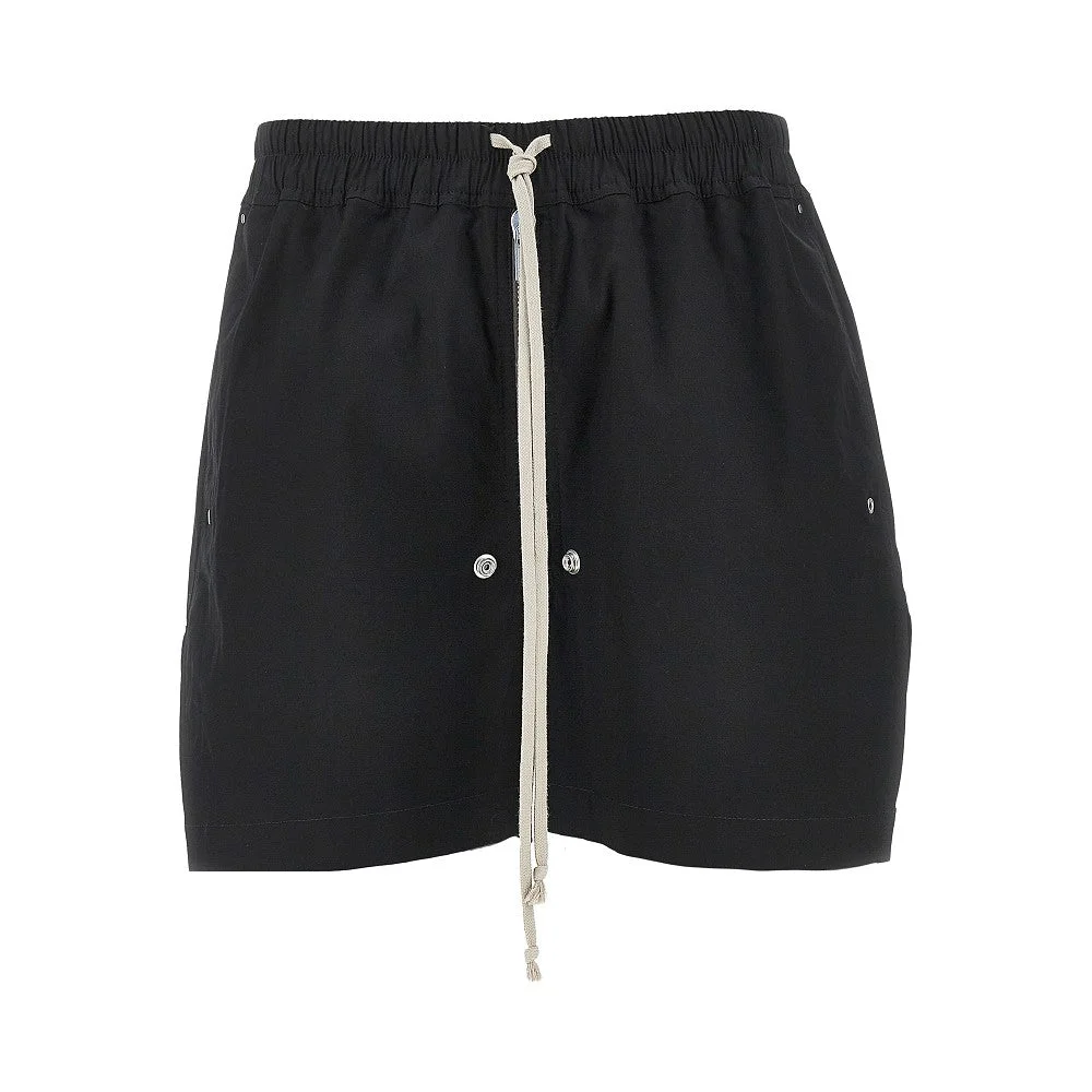 Bermuda shorts made from slightly stretch cotton thick popline. Elasticated waist, long drawstring and zip fly. Side welt pockets. Leg with straight, wide cut and side splits on the bottom. DETAILS Model code: RU01F2391 Color code: 09 Season: SS26 Material: 97% CO, 3% EA Made in: Moldova Sku: 33018 Color: Black Brand: RICK OWENS