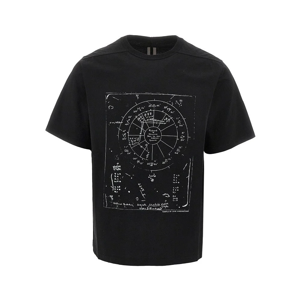Short-sleeved T-shirt made from cotton jersey, enriched with designer's astrological natal chart print at front. Micro ribbed crewneck. Signature single seam at back centre. Regular fit. DETAILS Model code: RR01F2232 Color code: 0911 Season: SS26 Material: 100% CO Made in: Italy Sku: 34002 Color: Black Brand: RICK OWENS