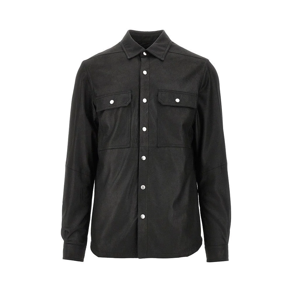 Overshirt made from soft and lightweight nappa leather, featuring webbing band applique at back of shoulders. Pointed collar, press-studs closure, chest patch pockets with flap and rounded-off cuffs with press-stud. Cotton lining. Regular fit. DETAILS Model code: RU01F2729 Color code: 09 Season: SS26 Material: 100% LH Made in: Moldova Sku: 30234 Color: Black Brand: RICK OWENS