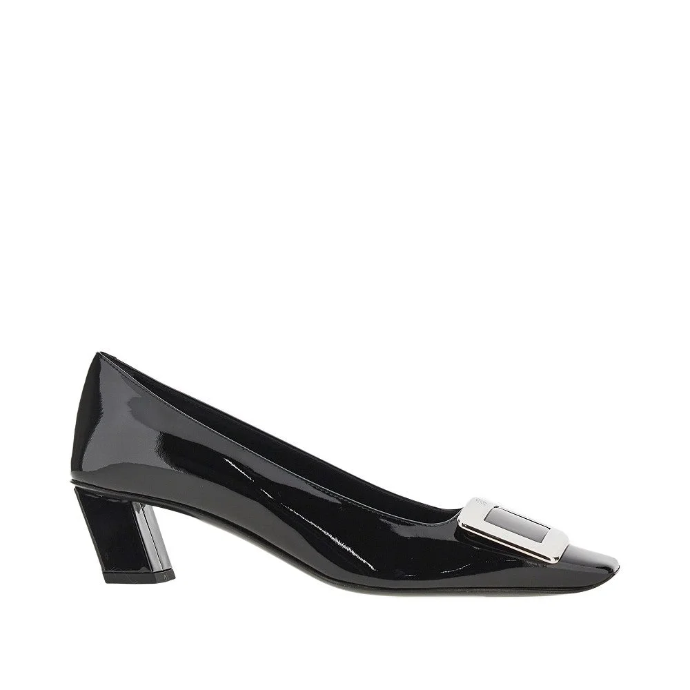 Pumps made from patent leather, enriched with silver-finished metal buckle with engraved RV logo. Squared elongated toe. Leather lining and insole. Patent leather covered Skyscraper heel. Leather sole. DETAILS Heel: 4,5 cm Model code: RVW00600920 Color code: B999 Season: SS26 Material: 100% LH Made in: Italy Sku: 29988 Color: Black Brand: ROGER VIVIER