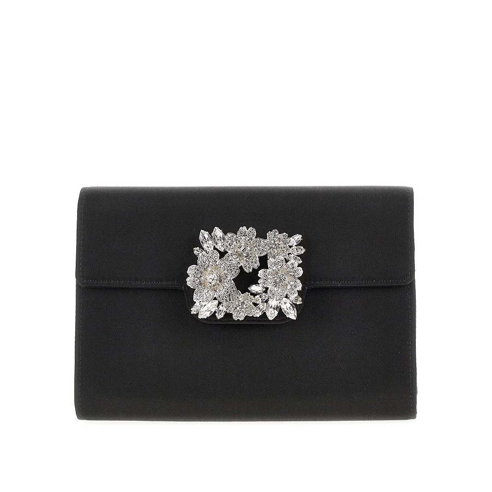 Pouch made from silk-blend satin, featuring flap with magnetic closure enriched with crystals-embellished Efflorescence buckle. Sliding chain strap in silver-finished metal. Satin-lined interior with a metallized leather patch card pocket. DETAILS Height: 13 cm Depth: 3,5 cm Width: 19 cm Strap: 100 cm Model code: RBWANVD0100 Color code: B999 Season: SS26 Material: 67% VI, 33% SE Made in: Italy Sku: 29995 Color: Black Brand: ROGER VIVIER