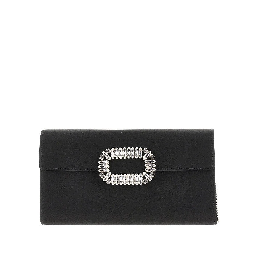Clutch made from silk-blend satin, featuring flap with magnetic closure enriched with crystals buckle. Gold-finished metal sliding chain strap. Satin-lined interior with two compartments. DETAILS Height: 13,5 cm Depth: 3 cm Width: 24 cm Strap: 115 cm Model code: RBWAMCD0200 Color code: B999 Season: SS26 Material: 67% VI, 33% SE Made in: Italy Sku: 29996 Color: Black Brand: ROGER VIVIER