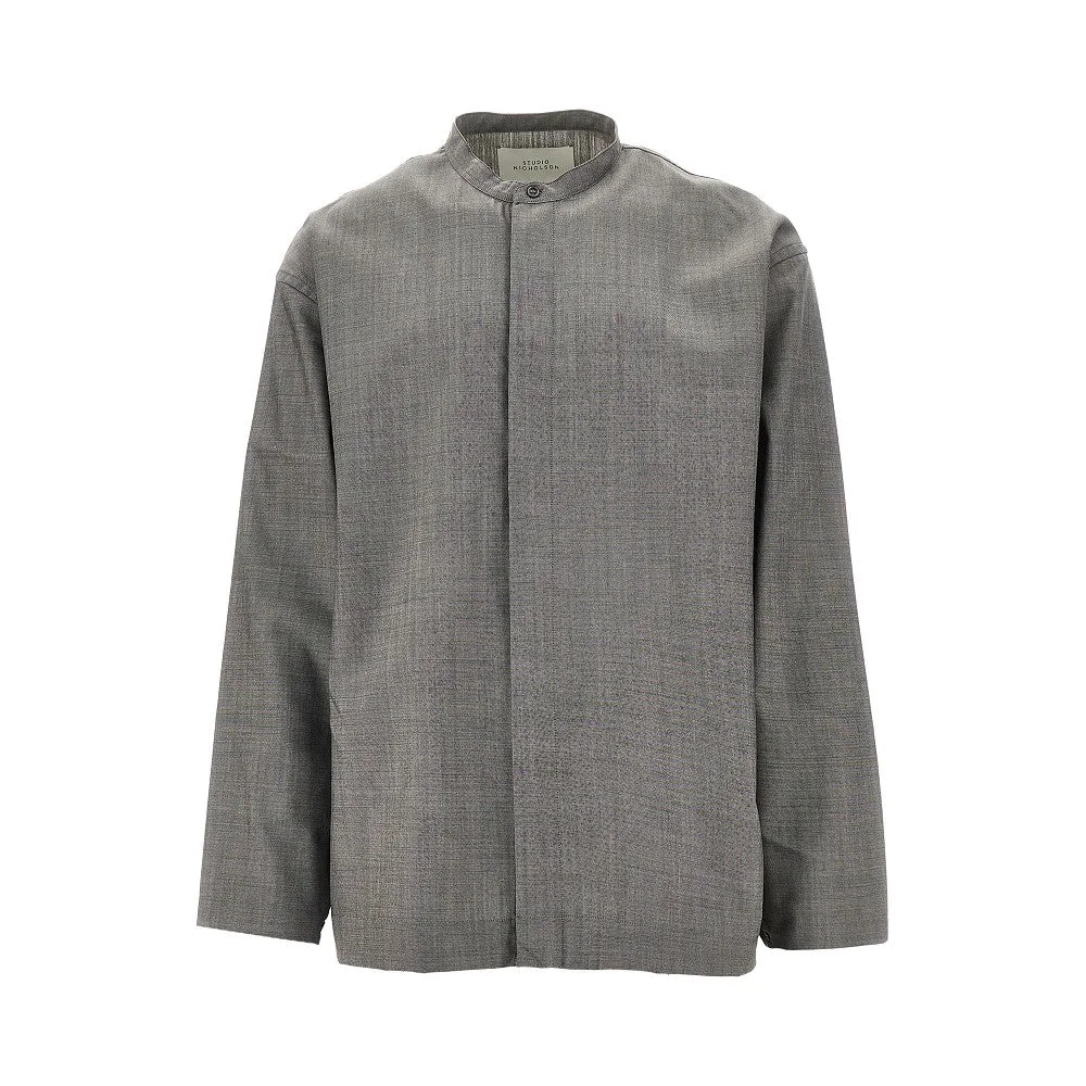 Shirt made from Tropical Wool, featuring loose and relaxed fit with slightly dropped shoulders. Mandarin collar, concealed buttons closure, adjustable cuffs with buttons and side slits at bottom hem. DETAILS Model code: 1426 Color code: WARM GREY Season: SS26 Material: 100% WO Made in: Portugal Sku: 32307 Color: Grey Brand: STUDIO NICHOLSON