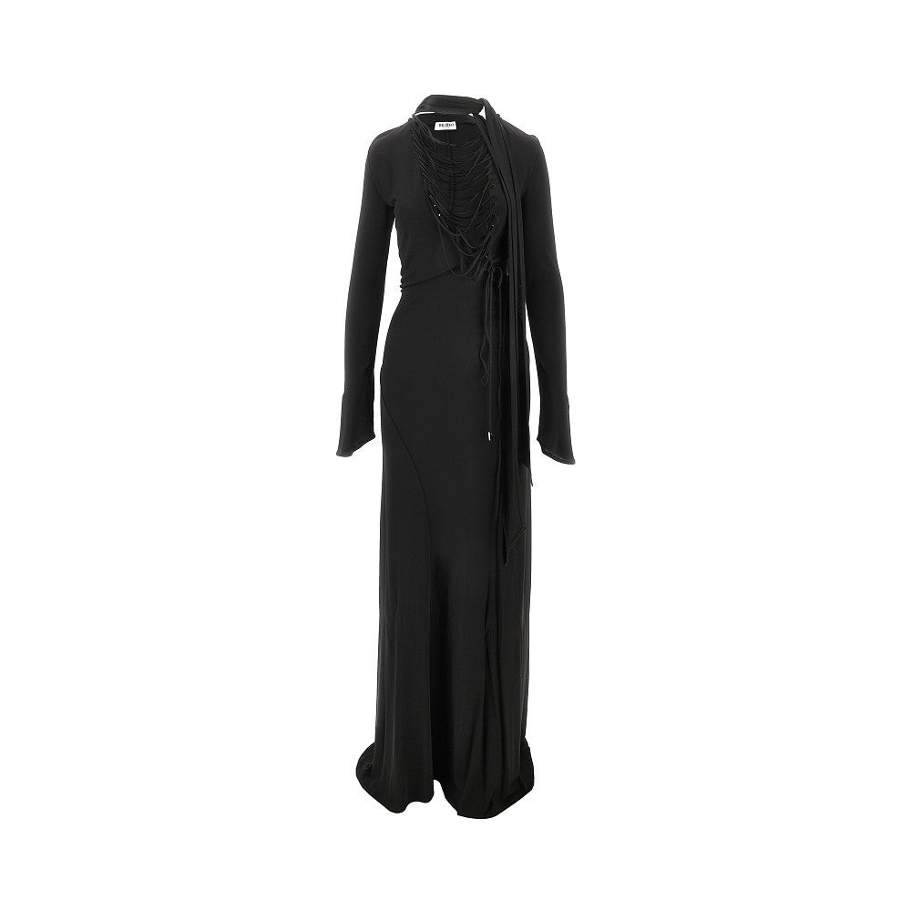 Long-sleeved dress made from viscose crepe, featuring asymmetrical plunging neckline with lacing detail. Detachable scarf to wrap at neck. Fitted silhouette and fluid skirt with tail. DETAILS Codice Modello: 251WCW00243 Stagione: FW25 Materiale: 100% VI Made in: Italy Sku: 23861 Brand: THE ATTICO