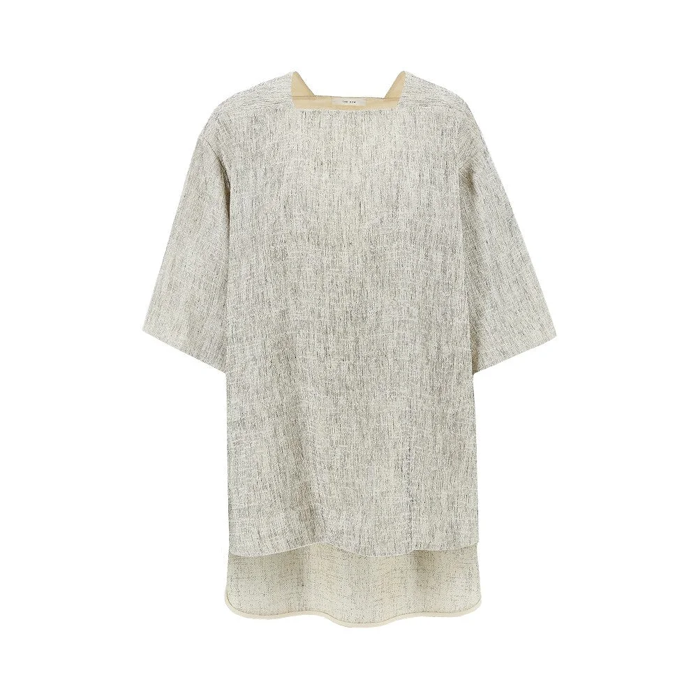 Short-sleeved top made from salt and pepper silk and linen blend fabric. Oversized silhouette with cotton lining creating volume and structure on the shoulders. Squared neckline. Asymmetrical hem with longer and rounded back. DETAILS Model code: 10817 Color code: WBK Season: SS26 Material: 64% LI, 36% SE Made in: Italy Sku: 33322 Color: Grey Brand: THE ROW