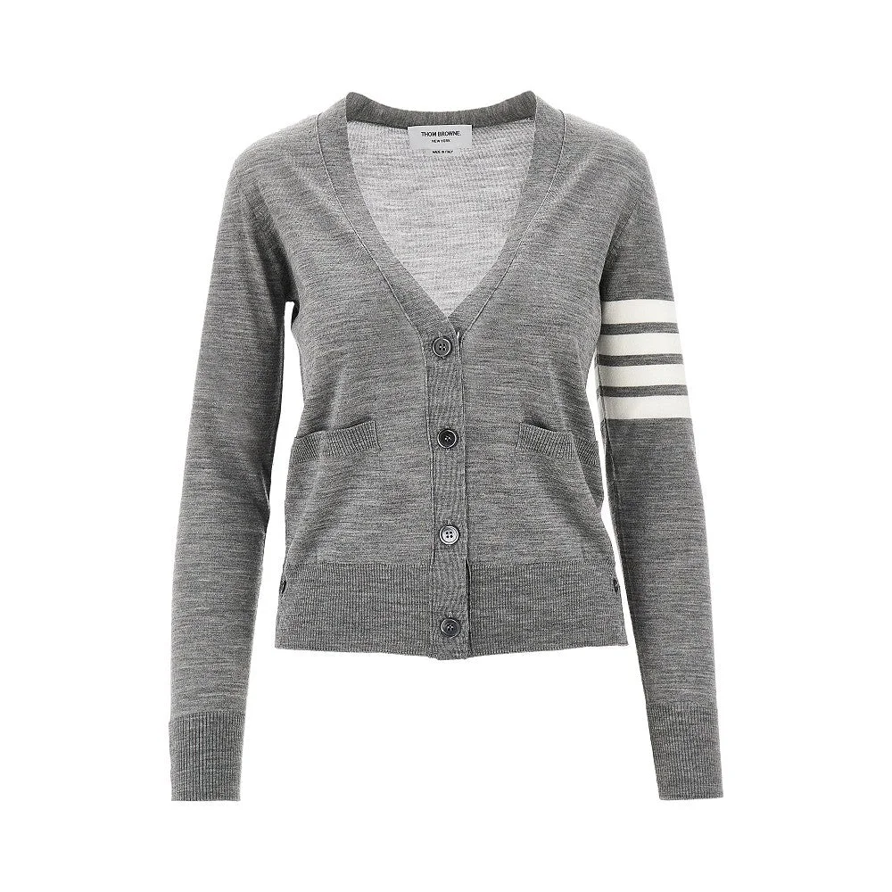 Cardigan made from fine merino wool yarn, featuring signature 4 Bar inlay on the left sleeve. V-neck and front buttons closure with tricolour ribbon trim. Front welt pockets. Ribbed edges. Bottom sides and cuffs splits with buttons and tricolour ribbon trim. Relaxed fit. DETAILS Model code: FKC334A Color code: 055 Season: SS26 Material: 100% WV Made in: Italy Sku: 29007 Color: Grey Brand: THOM BROWNE