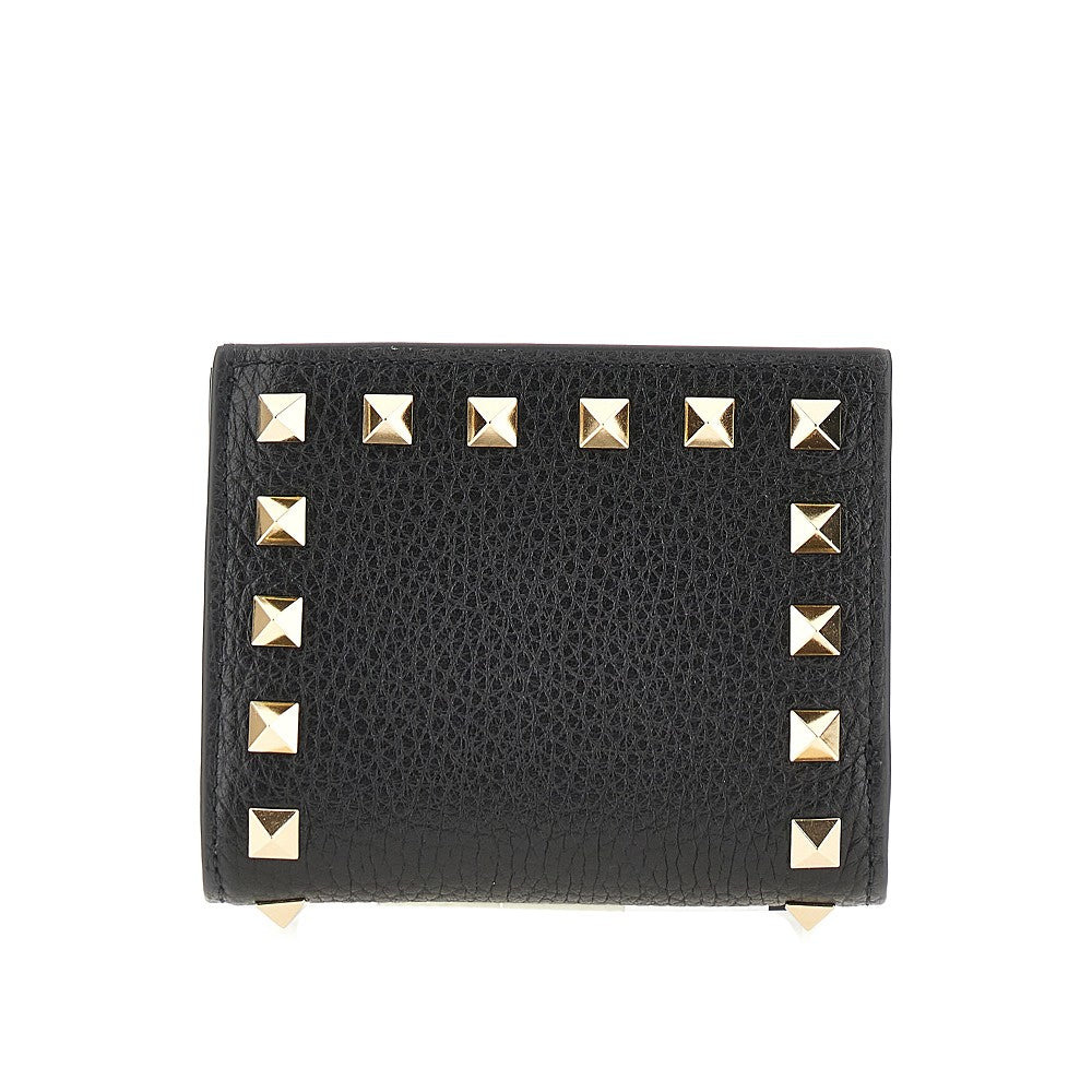 Small bi-fold wallet made from grained leather, enriched with signature Rockstud studs in gold-finished metal. Press-stud closure. Leather interior with fabric-lined banknote compartment and six card slots. Zippered coin pocket. DETAILS Height: 10,5 cm Depth: 2 cm Width: 8,5 cm Codice Modello: 7W2P0AR5 Stagione: FW25 Materiale: 100% LH Made in: Italy Sku: 25651 Brand: VALENTINO GARAVANI