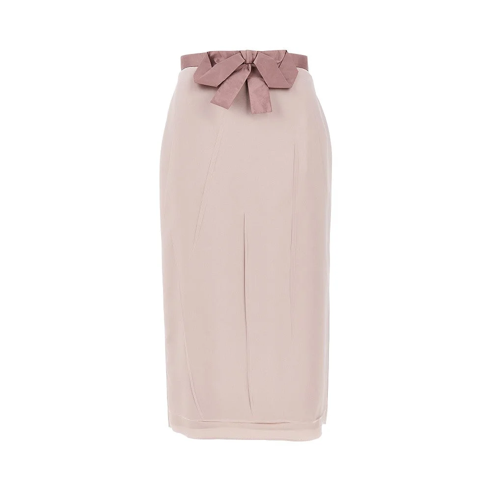 Midi skirt made from satin with creased effect, enriched with silk taffeta waistband with decorative bow. Unfinished hem. Straight and regular silhouette with mid-rise waist and middle split at back. Habotai silk lining. Concealed zip and hook closure at back. DETAILS Model code: 7B0RAEC5 Color code: 9WA Season: FW25 Material: 100% AC, 100% SE Made in: Italy Sku: 29131 Color: Purple Brand: VALENTINO