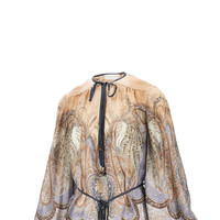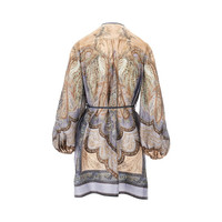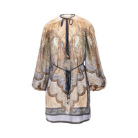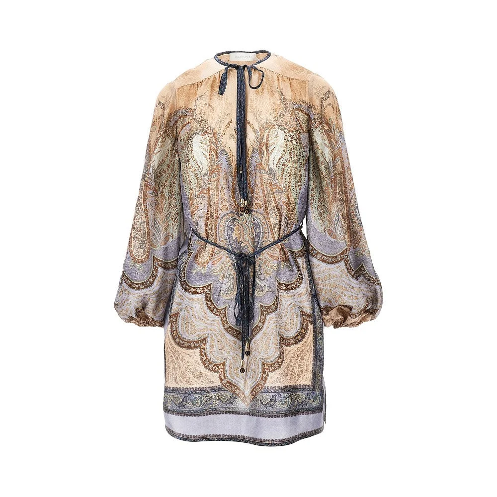 Tunic mini dress or shirt made from silk habotai with tapestry motif. Crewneck with self-tie closure. Long puff sleeves with elasticated hem. Straight and regular cut with side splits and removable self-tie matching lace at waist. DETAILS Model code: 5807DRS262 Color code: TPBL Season: SS26 Material: 100% SE Made in: Vietnam Sku: 29920 Color: Blue Brand: ZIMMERMANN