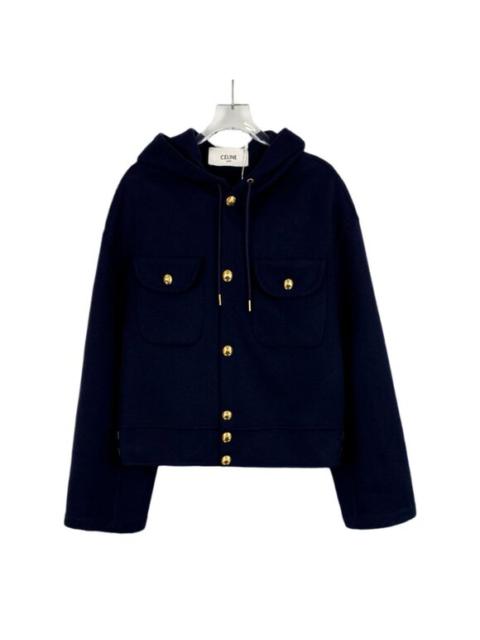 Celine Dark Blue Cashmere Hooded Jacket With Gold Button Details & Drawstring