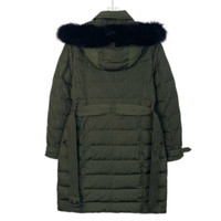 Grade A Burberry Q11383 Brit Series Army Green Hooded Double-Breasted Belted Down Jacket, size M, 98% new, originally priced at approximately $1,783 USD, a stylish and practical choice for elevated winter wear.