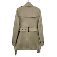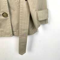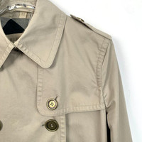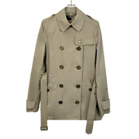 This Burberry trench coat offers a classic and timeless appeal, featuring a double-breasted design and a removable belt for added style and functionality. The beige color adds versatility, making it a suitable choice for various occasions while maintaining a professional appearance. • Double-breasted design • Removable belt • Epaulettes on shoulders • Buttoned cuffs • Back vent • Front pockets Minor stains on the front and back, unnoticeable from a distance. X12274 Size: Womens 40 Condition: Pre-Owned Like New