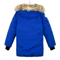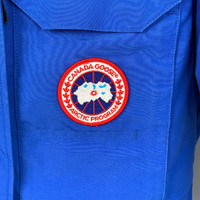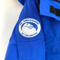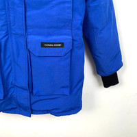 Grade A H12602 Canada Goose Blue Hooded Down Jacket with Fur Trim and Logo Patch, Size XS, 95% new with slight discoloration. Original price: $2,040. Stay warm and stylish with this iconic winter essential—shop now and make it yours!