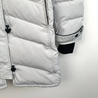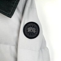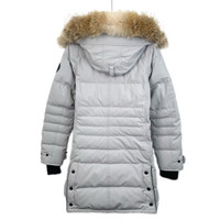 Grade A Canada Goose H10380 White Logo Patch Hooded Parka with Fur Trim, size XS, 95% new with dust bag and hanger, featuring yellowing on pocket edges, minor stains, and cuff discoloration, originally priced at approximately $1,257 USD, a stylish and warm winter essential with practical detailing.