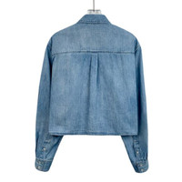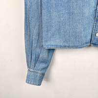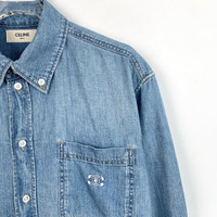 Grade A X12595 Celine Blue Cotton Long-Sleeve Denim Shirt with Triomphe Embroidery and Collared Design, Size M, 95% new with slight yellowing stains. Add timeless sophistication to your wardrobe—shop now and make it yours!