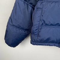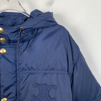 S-Grade Celine X11429 Blue Triomphe Logo Embroidered Hooded Down Jacket, size 36 (XS), 98% new, originally priced at approximately $3,157 USD, a luxurious and stylish outerwear choice with iconic detailing.