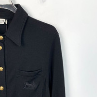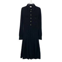 A sophisticated choice for business or evening events, this Celine dress combines timeless elegance with contemporary style. The pleated skirt adds movement while the embroidered logo on the chest pocket subtly displays the brand's prestige. • Long sleeves with buttoned cuffs • Gold button front closure • Embroidered logo on chest pocket • Pleated skirt design H13688 Size: Womens M Condition: New With Tags