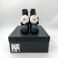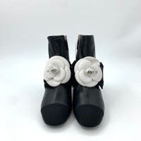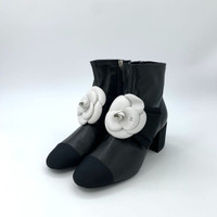 Elegant and iconic Chanel ankle boots crafted from black leather, featuring a striking camellia flower detail. Perfectly combines sophistication with comfort. • Chunky heel for stability • Side zipper closure • Signature camellia flower embellishment • Includes original shoebox • Made in Italy for premium quality Slight scuff on sole; otherwise new condition. H11355