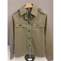Crafted with high-quality materials, this Chanel jacket combines a structured military-inspired design with luxurious tweed detailing for a refined, professional look. • Button closures for easy wear • Textured tweed detailing on shoulders and back • Front flap pockets with buttons • Epaulettes with button accents • Long sleeves with button cuffs Size: Womens 34 Condition: Pre-Owned Like New