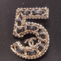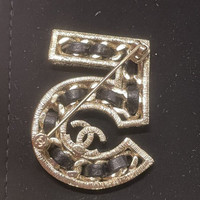 Chanel No. 5-Inspired Brooch With Black Leather & Gold Chain Accents Crystal Det