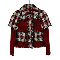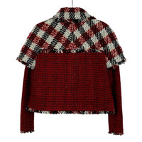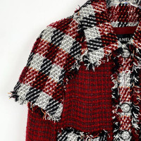 Chanel Red & Black Tweed Plaid Fringed Jacket With Decorative Buttons