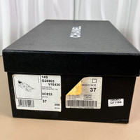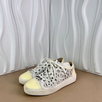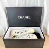 Stylish Chanel sneakers featuring intricate cutouts and patent leather accents. With a timeless double C logo, these shoes offer sophistication and comfort. • Women's size 37 • Original packaging included • Durable rubber soles • Lace-up closure • Intricate cutout design 000730