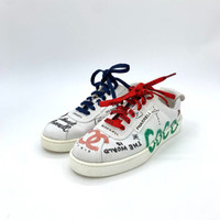These sneakers showcase a collaboration between Chanel and Pharrell, blending craftsmanship with artistic flair. Designed with graffiti graphics and multicolor laces, they offer both luxury and individuality. • Lace-up closure with multicolor laces • Graffiti-inspired graphics • Rubber sole for durability • Made in Italy • Chanel branding on insole and sole h13107