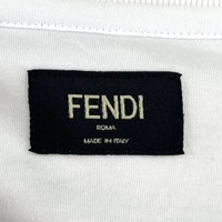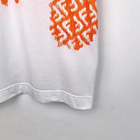 This Fendi men's t-shirt features the signature logo in an eye-catching orange on a white backdrop. Crafted from 100% cotton, it offers comfort and breathability. Made in Italy, this piece reflects the brand's high-quality craftsmanship and stylish design, making it a standout addition to any wardrobe. • Crew neck design • Short sleeves • High-quality embroidery • Relaxed fit • Machine washable Back shows slight pink discoloration. X12678