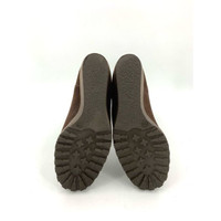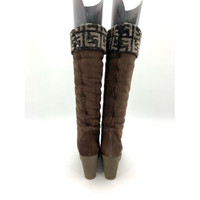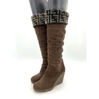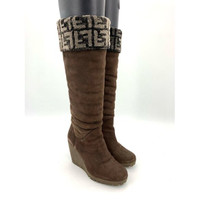 Fendi Womens Suede Wedge High Boots With Logo Cuff Brown Size 35.5 Made In Italy