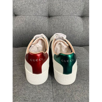 Designed with precision, these luxury sneakers feature a signature embroidered bee detail, premium leather construction, and a comfortable platform sole for durability and style. • Embroidered bee motif on green and red stripe • Premium leather upper and lining • Durable rubber sole with treaded grip • Comes with original Gucci box and dust bag 000972