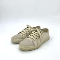 These Gucci sneakers combine elegance and functionality, featuring a blend of leather and canvas materials. The lace-up design provides a secure fit, while the beige color adds a versatile touch. Crafted in Italy, these sneakers exemplify high-quality craftsmanship and style, suitable for various occasions. • Lace-Up Closure • Rubber Sole • Made in Italy Minor scuffs on the front toe area, otherwise in excellent condition. H12739