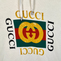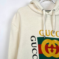 Grade A H12258 Gucci Beige Logo Print Cotton Hoodie with Drawstring Hood, Size S, 95% new with slight yellowing stains. Original price: $1,125. Upgrade your wardrobe with this iconic piece—grab it now before it’s gone!
