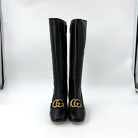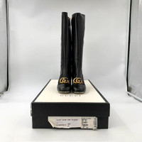Crafted from high-quality leather, these knee-high boots feature a bold gold double G buckle, thick heels for enhanced comfort, and premium craftsmanship. H14486 • Made from durable black leather • Thick heels for stability • Features gold-tone double G buckle • Includes original branded box • Unique floral pattern sole