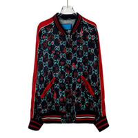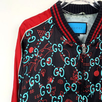 Gucci Black & Red G Monogram Print Bomber Jacket With Ribbed Trim & Zip Closure