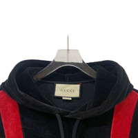 This Gucci hoodie offers an elegant blend of comfort and style with its velour fabric. The striking red and green stripes enhance its luxurious appeal, while the black color offers versatility. Crafted in Italy, it provides a sophisticated look, suitable for diverse settings. • Long sleeves • Drawstring hood • Ribbed hem and cuffs • Pullover style • Made in Italy 001169