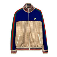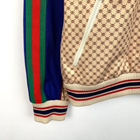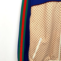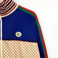 S Grade J12586 Gucci Colorblock Monogram Print Zip-Up Jacket with Striped Design, Size S, 98% new with original tags. Elevate your wardrobe with this bold and luxurious piece—shop now and make it yours!