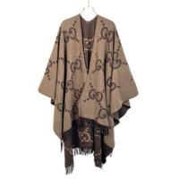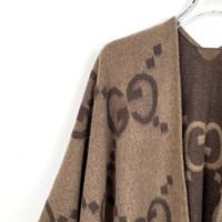This luxurious Gucci poncho, adorned with the iconic GG logo, combines the warmth of wool with the softness of cashmere. The refined design features a fringe trim, providing elegance and sophistication for cooler days. Its neutral brown and beige tones make it a versatile addition to any wardrobe. • Open-front design • Fringe detailing • Neutral color scheme • Iconic GG pattern X12675