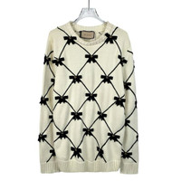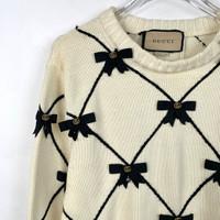 Elegant ivory sweater featuring intricate black bow detailing and GG logos. Crafted from premium wool for warmth and style. Made in Italy. • Ribbed cuffs and hem for a snug fit • Sophisticated diamond-patterned bow accents • Crewneck design for classic appeal H10607 Size: Womens XS Condition: Pre-Owned Like New