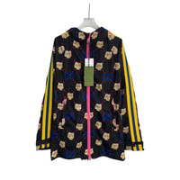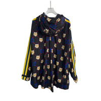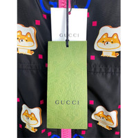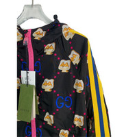 This Gucci Kids Hooded Jacket features a playful cartoon dog and GG print, offering a stylish blend of luxury and fun. The jacket is designed with vibrant yellow and blue stripes on the sleeves, adding a pop of color to the black base. • Full-length front zipper closure • Hooded design with drawstrings • Elastic cuffs and hem • Lightweight and comfortable • Signature Gucci branding 00417