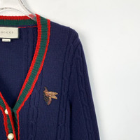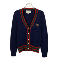 Grade A H12545 Gucci Navy Blue Striped Wool Knit Cardigan with Bee Embroidery, Size L, 98% new. Add a classic yet distinctive piece to your wardrobe—shop now and make it yours!