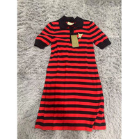 This Gucci red and black striped knit dress, crafted in Italy, features a playful dog patch and a classic polo collar. Its design offers a unique blend of style and sophistication, making it a versatile addition to any wardrobe. • Polo collar design • Embroidered dog patch • Short sleeves • Made in Italy Size: Womens S Condition: New With Tags