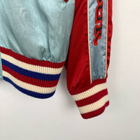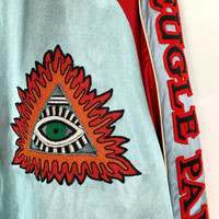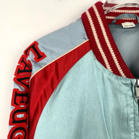 This satin bomber jacket features intricate embroidery, including an eye symbol and floral design, with bold red and blue accents for standout style. • Satin fabric construction • Zipper front closure • Ribbed collar, cuffs, and hem • Side pockets for functionality • Intricate embroidered details • Made in Italy 015811 Size: Womens 48 Condition: Pre-Owned Like New
