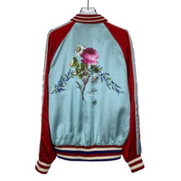 Gucci Style Satin Bomber Jacket With Embroidered Eye & Floral Designs Red & Blue