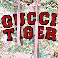 This hoodie features an intricate floral and tiger pattern with bold "Gucci Tiger" lettering. Crafted for comfort and style, it's a statement piece. • Adjustable drawstring hood • Vibrant multicolor design with tiger motif • Ribbed hem and cuffs • Soft cotton blend fabric H10586 Size: Womens M Condition: Pre-Owned Like New