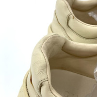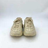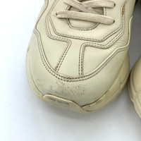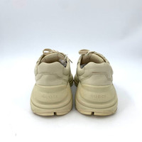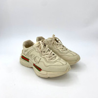 These sneakers from Gucci epitomize casual luxury with their distinct design and premium ivory leather construction. The Rhyton design offers a comfortable fit along with a signature brand aesthetic that pairs effortlessly with various outfits. • Chunky design with lace-up closure • Brand logo on the side • Rubber sole with good grip • Padded collar for added comfort Minor scuffs on the toe box and slight wear on the inner heel. H12755 Size: Mens 40 Condition: Pre-Owned Like New
