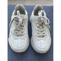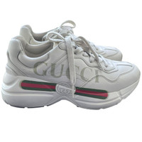 Crafted in Italy, these Gucci Rhyton sneakers showcase a bold logo design and superior craftsmanship. Designed for comfort and style with premium leather. • Lace-up closure for adjustable fit • Bold Gucci logo design on side • Padded collar for comfort • Textured rubber sole for traction • Made in Italy Size: Womens 35.5 Condition: Pre-Owned Like New