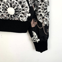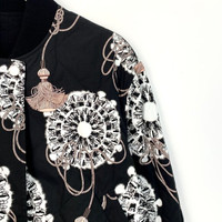 This versatile bomber jacket features a stunning embroidered floral design on one side and a solid black finish on the other. A unique piece for transitional weather, offering both style and functionality for diverse fashion needs. • Reversible design with embroidered pattern • Front zip closure • Ribbed collar, cuffs, and hem • Two front pockets on solid side H13830 Size: Womens 38 Condition: Pre-Owned Like New